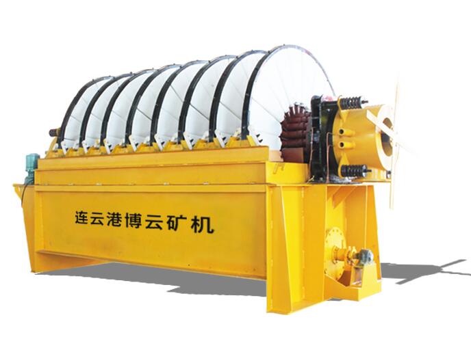 盤式真空過濾機(jī)由各個單獨的扇形片的圓盤構(gòu)成。每一個扇形片為 單獨的過濾單元,由濾布做成布套在扇形片上形成濾室。過濾盤由電機(jī)通過減速器及開式齒輪傳動來驅(qū)動 ,過濾盤順時針方向轉(zhuǎn)動,濾室里的礦漿在吸附區(qū)借助于真空泵在過濾介質(zhì)兩側(cè)形成的壓力差,附著在過 濾盤上形成濾餅后,攪拌器旋轉(zhuǎn)防止固體沉淀,濾餅離開液面后,在真空作用下繼續(xù)脫去水分。濾液透過 濾布,經(jīng)過濾液管,從分配頭排出。濾餅在卸料區(qū)由反吹風(fēng)卸料落入排料槽,整個作業(yè)過程連續(xù)循環(huán)進(jìn)行 。