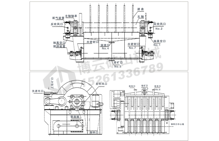 連云港博云礦山機械生產的PG系列盤式真空過濾機 (1)扇形濾板脫水孔分布均勻,孔率合理,筋條尺寸大,由高強度工程塑料制成,壽命提高了2-3倍。 (2)濾液管過濾數面大,分配頭腹腔容積大,提高了抽氣率和濾液排放效果。 (3)耐磨錦綸、單或復絲濾布使脫餅率高且不易堵塞,使用壽命長。 (4)多點干油泵集中多點自動潤滑。 (5)濾布自動清洗裝置,保持了其良好的脫水效果。 (6)臥式強制高速攪拌、軸端采用橡膠及石墨盤根和水壓差三重密封不漏漿。 (7)主傳動無級變速,依物料的濃度及流量調節(交流調速電機或變頻器),以求達到理想的工作效果 。 (8)每盤由20片扇形板組成,加強了過濾過程控制,成餅厚度均勻。 (9)磨擦片采用特制耐磨硼鑄鐵,剛柔相濟密封佳,使用壽命達到十年以上。 (10)濾液管為高強度耐磨陶瓷復合鋼管,提高壽命10倍以上。 (11)濾液管與濾扇接口去掉下法蘭,采取模具定位直接焊接,減少了90%可能的漏氣點。